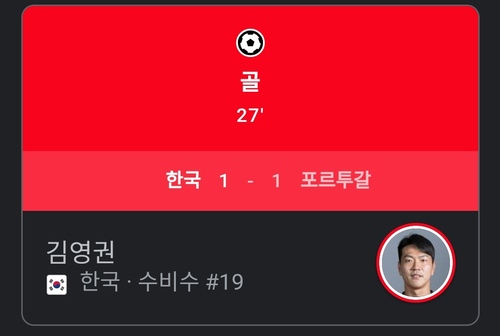 전반 27분 이강인의 패스가 호날두의 몸에 맞고 굴절됐고, 골문 앞에 있던 김영권이 왼발로 밀어넣으며 포르투갈과 1-1 동점을 만들었습니다.