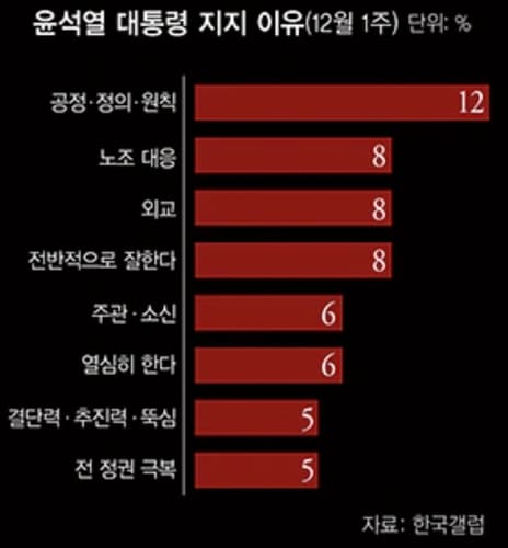 여론조사공정이 지난 12월 8일 발표한 조사에서 윤 대통령 지지율은 41.5%로 2주일 전(32.4%)에 비해 9.1%포인트 올랐다. 지난 5일 리얼미터가 발표한 조사(ARS)에서 윤 대통령의 국정 수행에 대한 긍정 평가는 38.9%로 2주 전 33.4%, 일주일 전 36.4%에서 상승세가 이어졌다. 반면 윤 대통령에 대한 부정 평가는 63.8→60.8→58.9%로 낮아졌다.