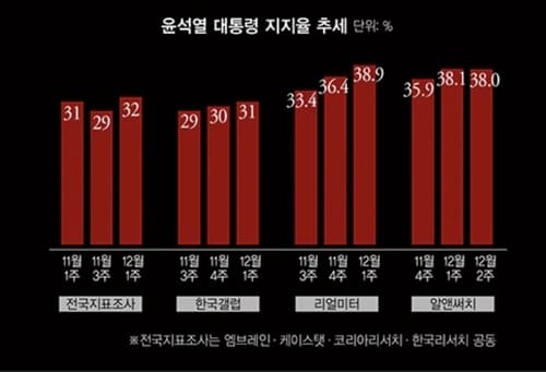 한국갤럽이 지난 12월 2일 발표한 조사(전화면접원 조사)에서도 윤 대통령 지지율은 2주 전에 비해 29→30→31%로 상승곡선을 그렸다. 매주 실시하는 미디어토마토(29.9→35.5%)도 지지율이 5.6%포인트 올랐고, 케이스탯리서치 등 4개 회사가 격주로 공동 실시하는 전국지표조사(NBS)에선 29%에서 32%로 올랐다. 지난 7일 발표한 알앤써치(38.0%)와 조원씨앤아이(38.4%), 에이스리서치(39.5%) 조사 등도 윤 대통령 지지율이 40%에 육박했다.