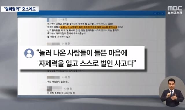 숨진 10대 A군의 어머니는 “꼭 전할 말이 있다”며 14일 MBC뉴스 인터뷰에 응했다. 그는 “(아이가) 11월 중순 정도에 울면서 얘기를 한 적이 있었다. ‘연예인 보려고 놀러 가서 그렇게 다치고 죽은 거 아니냐’는 등 자기 죽은 친구들을 모욕하는 듯한 댓글들을 보면서 굉장히 화를 많이 냈다”고 털어놨다.