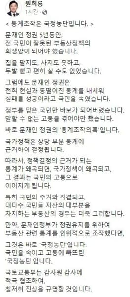 원 장관은 이어 “만약 문재인 정부가 정권유지를 위하여 부동산 관련 통계를 인위적으로 조작했다면 그것은 바로 ‘국정농단’이다”라면서 “국토부는 감사원 감사에 적극 협조해 철저히 진상을 규명할 것”이라고 밝혔다.