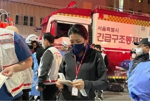 의사 출신인 신현영 더불어민주당 의원이 30일 새벽 이태원 해밀턴 호텔 앞에서 구조활동에 나선 모습. 신현영 의원 에스엔에스 갈무리