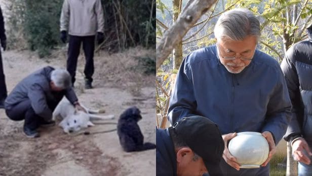 문재인 전 대통령의 반려견 '마루'가 산책 도중 누워 있다(왼쪽). 문 전 대통령이 마루의 유골함을 들고 있다. /문다혜씨 페이스북