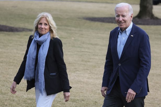미국령 버진아일랜드 세인트크로이섬에서 연말연시 휴가를 보낸 조 바이든 대통령 부부가 2일(현지 시각) 오후 워싱턴DC에 복귀해 백악관 앞마당에 들어서고 있다. /UPI 연합뉴스