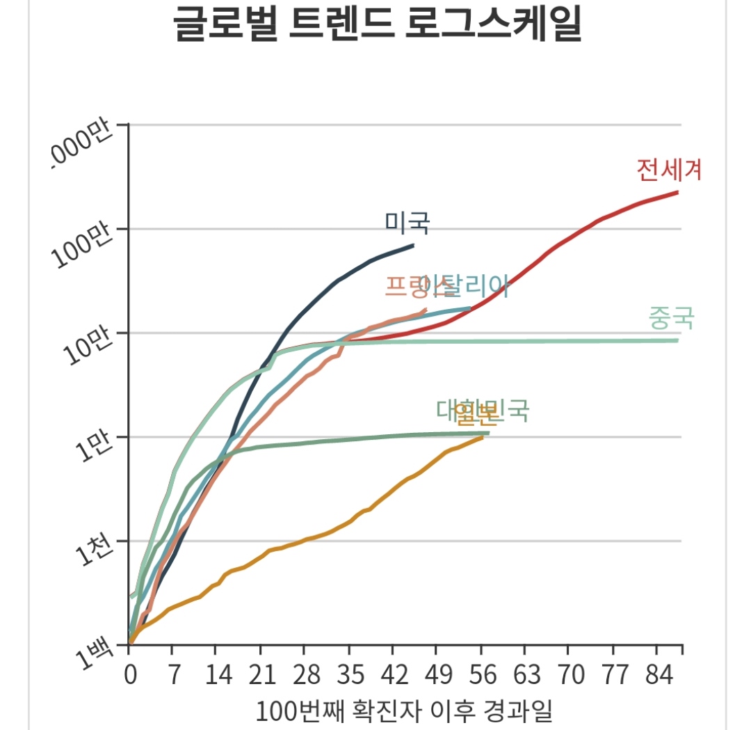 우선 그들의 확진자 100명 이후의 증가세를 보는 것이 명확하다 볼 수 있다.