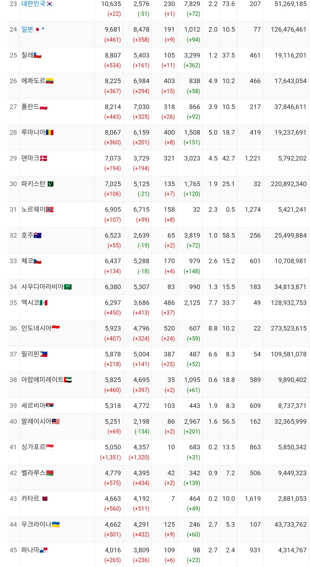 성실하게, 진실하게 코로나19 검사를 했었다면 진즉에 순위가 뒤바뀌었겠지만 이제 오늘 내일 순위가 뒤바뀌지 싶다. 대한민국은 0시에 검사 결과를 발표하는 반면 일본은 아마도 저녁에 발표하는 것 같다. 애매한 타이밍에 추가 수치가 발표되는 것 같다.