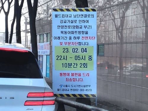 월드컵대교 남단연결로의강교가설로 인하여 안양천로(양화교 부근)목동아파트방향을 아래 기간 중 하루 전면차단 및 부분차단 합니다.목동근린공원 좌회전후 양화교방향 우회전 우회도로 ..