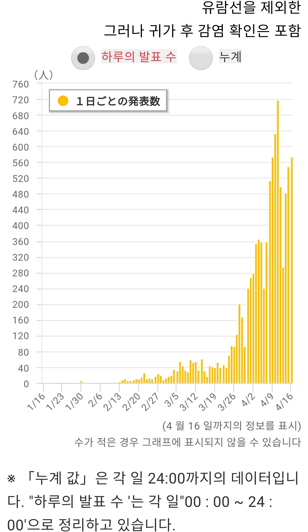 16일까지 누계이고, 이 그래프에서는 일본크루즈는 제외되고 있다.