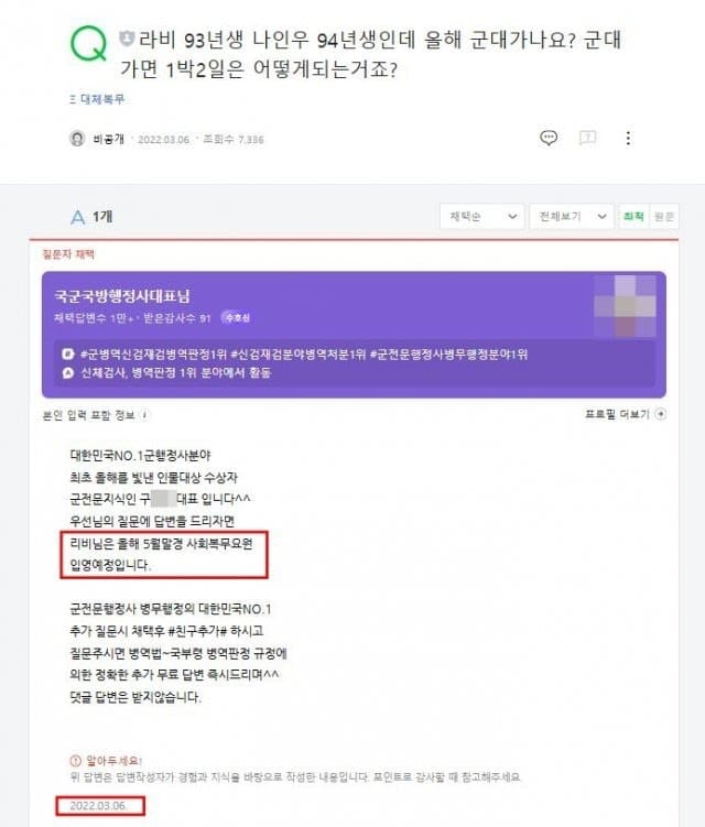 구 씨는 지난해 3월 네이버 지식인에 라비의 입대 날짜에 대한 질문이 올라오자 “라비 님은 올해 5월 말경 사회복무요원으로 입영 예정”이라고 답했다. 당시 라비는 KBS2 예능 프로그램 ‘1박2일’에 멀쩡히 출연 중인 상태로 그의 입대일이나 복무 방식 등이 전혀 알려지지 않은 상황이었다.
