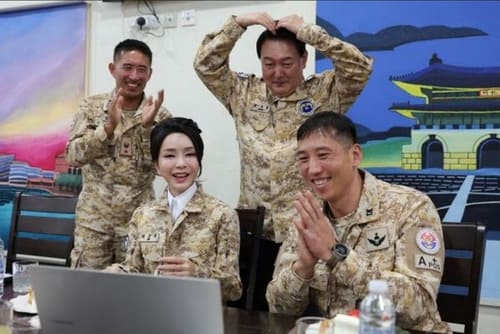 아랍에미리트(UAE)를 국빈 방문 중인 윤석열 대통령과 김건희 여사가 15일(현지시간) 현지에 파병중인 아크부대를 방문해 장병 가족들과 화상 통화하고 있다. /뉴시스