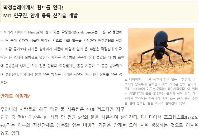 나미브 사막에 사는 딱정벌레는 새벽녘에 사막에 내리는 이슬을
