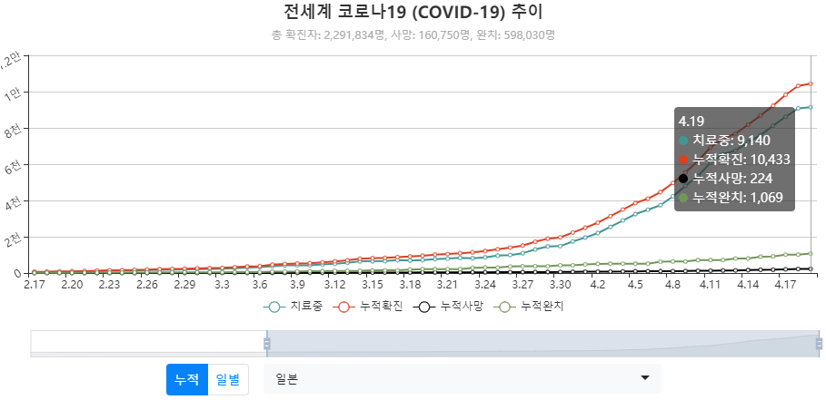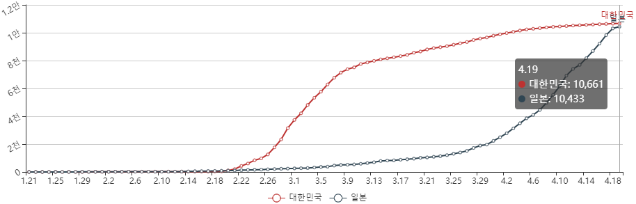 | 일본 코로나19 인구대비 확진자수 최소 2만명, 최대 20만명 무난히 달성할 듯, 확진률 2000(미국)으로 예상해본다면 (0) | 2020.04.17 |