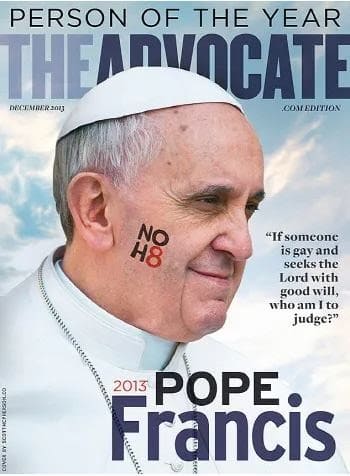 2013년 12월 미국 최대의 성소수자 잡지 ‘어드보케이트’의 표지가 프란치스코 교황과 “(동성애자 사제를) 감히 판단할 수 없다”던 그의 발언으로 장식됐다. 어드보케이트는 그해의 인물로 교황을 선정했다. 어드보케이트 홈페이지 캡처.