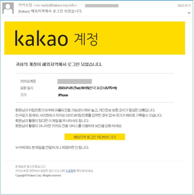 ‘카카오 해외지역 로그인 알림 메일’로 위장한 피싱 시도