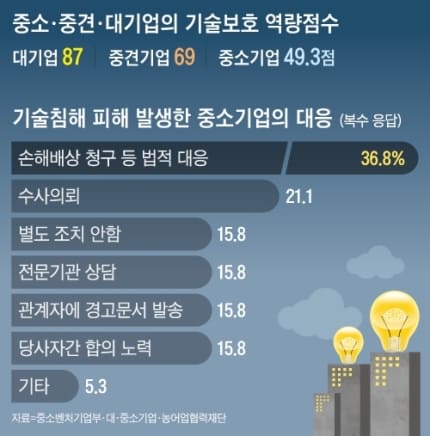 중소벤처기업부와 대·중소기업·농어업협력재단의 ‘2022년 중소기업 기술보호 수준 실태 조사’에 따르면 스타트업을 포함한 중소기업의 기술 보호 역량 점수는 49.3점으로 대기업(87점)의 절반 수준이다. 국내에서 기술 침해 피해를 당해도 중소기업의 15.8%는 별도 조치를 하지 않는 것으로 드러났다. 한 스타트업 대표는 “주변에 기술이나 아이디어 탈취 경험이 있는 대표들이 정말 많지만 대부분은 문제를 제기할 시도조차 안 하고 단념하고 다른 아이템을 찾아보는 경우가 많다”고 했다.