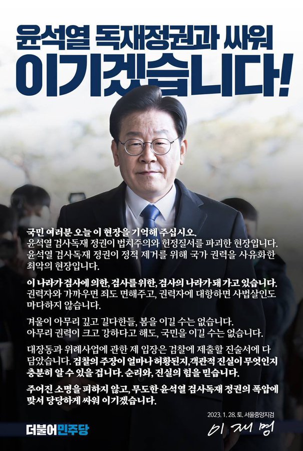李, 조사중 33쪽 진술서 페북에 올려… 진술서 없는 ‘정진상’ 질의에 답 안해