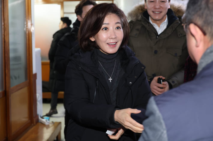 국민의힘 나경원 전 의원이 29일 서울 여의도 한 식당에서 열린 기자간담회에 참석하며 취재진과 인사하고 있다. 연합뉴스