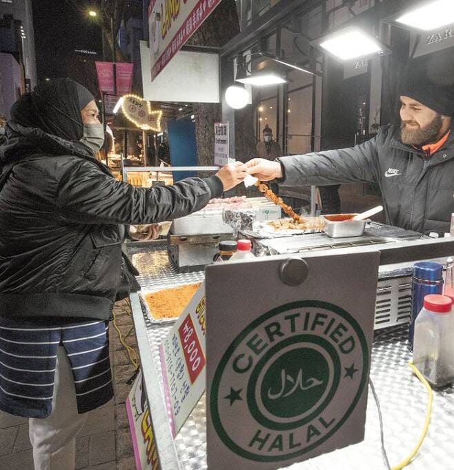 지난달 30일 오후 4시쯤 찾아간 서울 중구 명동의 중심가. 쇼핑몰 밀리오레로부터 명동예술극장에 이르는 약 300m 길이의 이 거리에는 닭꼬치와 호떡, 군밤 등 각양각색의 간식거리를 파는 노점 24곳이 영업 중이었다. 이 중 7곳은 눈에 잘 띄는 곳에 ‘할랄(Halal)’ 인증 마크를 내건 채였다. ‘할랄’은 아랍어로 ‘허용된 것’이란 뜻으로, ‘할랄 식품’은 이슬람 율법에 따라 이슬람교도(무슬림)가 먹어도 되는 식품을 뜻한다.