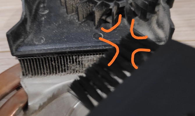 그래서 (1) 드라이버로 1차로 걷어내고, 마침 청소기의 (2) 먼지를 제거하는 솔이 있어서 그걸로 털어내고, (3) 진공청소기로 먼지를 완전 빨아냈다.