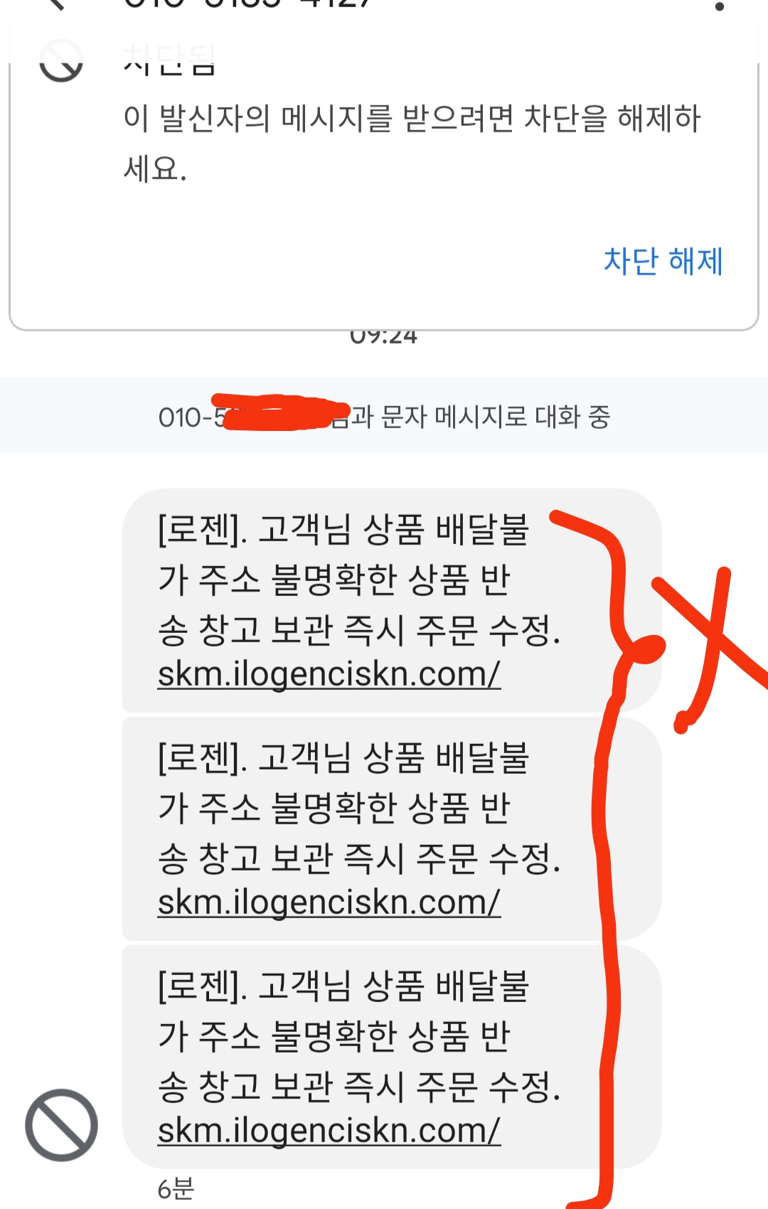 [스팸문자] "[로젠]. 고객님 상품 배달불가 주소 불명확한 상품 반송 창고 보관 즉시 주문 수정. skm 쩜 ilogenciskn 쩜 com" 핸드폰 번호 입력 후폭풍 사전예방 중요
