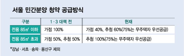 추첨제 물량은 저가점자는 물론 유주택자도 당첨될 수 있다. 다만 무주택자의 내집마련 기회를 보장하기 위해 추첨제 물량의 75%는 무주택자에게 우선 공급한다는 방침이다. 나머지 25%는 우선 공급에서 탈락한 무주택자와 유주택자가 경합해 가져가는 구조다.