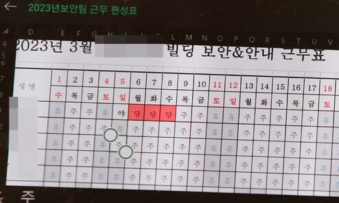 지난해부터 이 업체에서 일한 이씨는 팀장이었기 때문에 하루 8시간 주 5일 일하는 스케줄이었다. 그러나 보안대원들의 퇴사로 결원이 생기자 이를 메우려고 무리하게 근무를 하게 된 것이다. 지난 9일 이 빌딩에서 만난 보안 직원도 “팀원 2~3명가량이 부족해 사람을 구하는 과정에서 그 공백을 메우기 위해서 팀장님이 근무했다”고 증언했다.