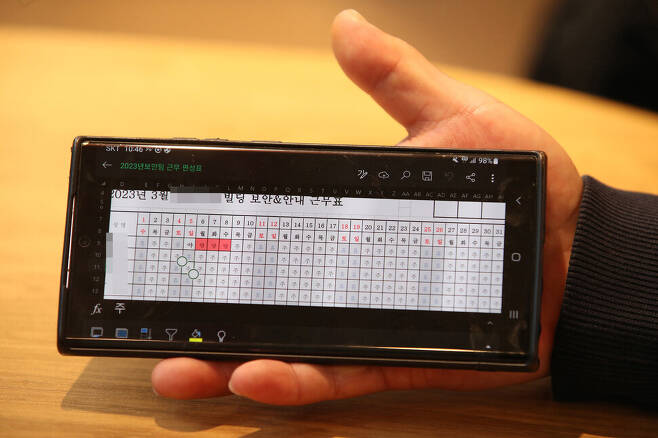 나흘에 걸쳐 62시간 근무하다 숨진 경비노동자의 유가족이 12일 오전 서울 종로구 한 카페에서 <한겨레>와 인터뷰를 하고 있다. 연속 당직근무일이 표시된 숨진 노동자의 근무표. 신소영 기자 viator@hani.co.kr