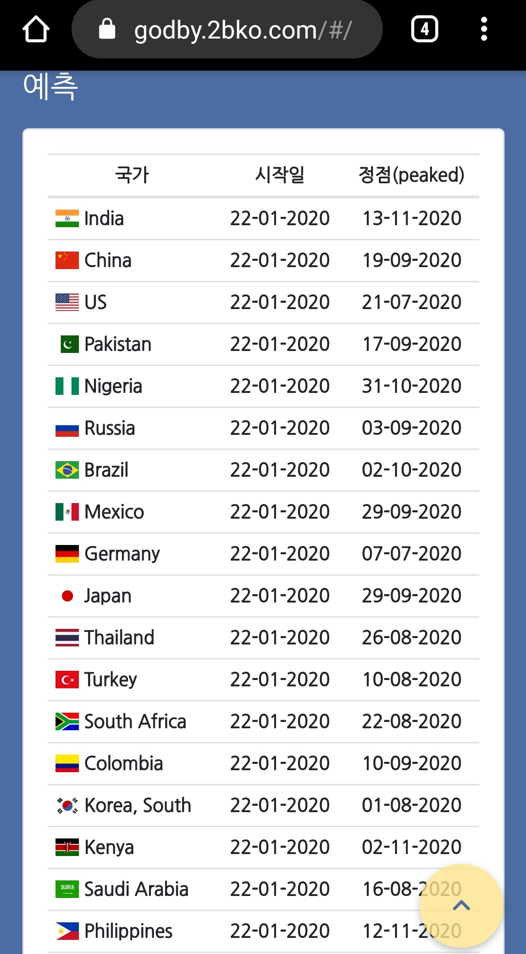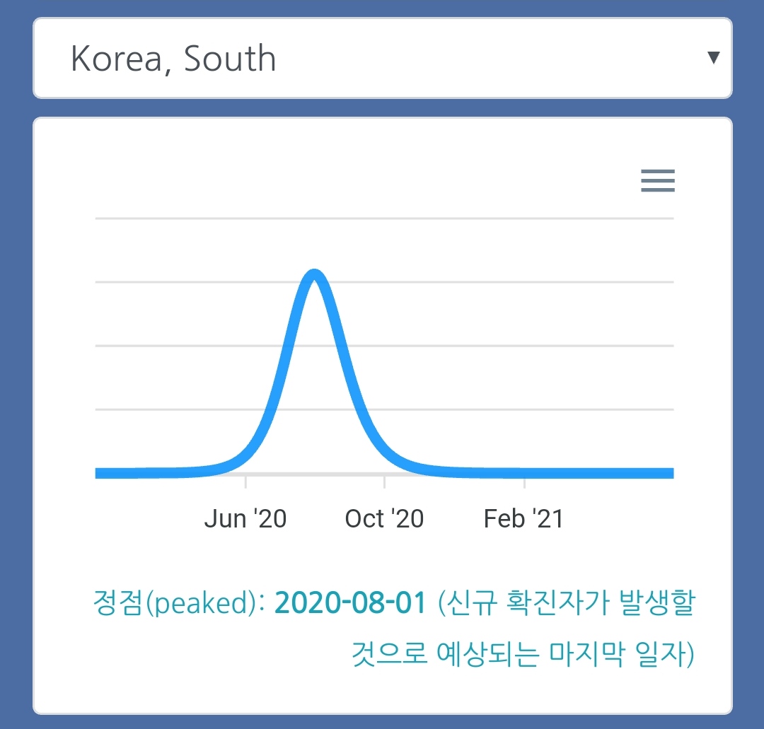※본 결과는 감염병 예측의 구획모델링(Compartment Modelling)인 SEIR 모델을 기초로 국가별 인구수, 기대수명 및 치사율 등을 고려하여 전세계적인 추이를 계산한 것입니다. 정점(Peaked)는 신규 환자가 발생하는 마지막 일자로, 정점 기준 다음날부터 신규확진자가 더 이상 발생하지 않을 것으로 예측됩니다. 감염에 대한 차별적 감수성, 접촉성, 면역반응의 차이 그리고 전파성 등과 같은 이질성 문제 등은 고려하지 않아 실제와 예측결과가 상이할 수 있습니다.