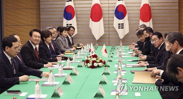 1박2일 일정으로 일본을 방문한 윤석열 대통령이 16일 오후 일본 도쿄 총리 관저에서 기시다 후미오 일본 총리와 한일 확대 정상회담을 하고 있다. 연합뉴스