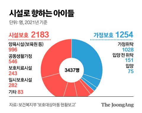 2021년 보호조치된 아동 3437명 중 3분의 2(2183명)가 시설로 향했다. 보육원 등 양육시설이 996명으로 가장 많았고, 공동생활가정(그룹홈) 546명, 보호치료시설 282명이 뒤를 이었다.