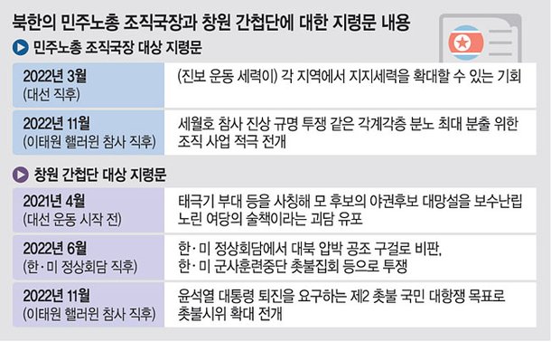 북한은 윤 대통령 대선 승리 후인 지난해 3월엔 A 씨에게 진보 운동 세력 확장 기회로 삼으라고 지시했다. 또 창원 간첩단에 지난해 5월 한·미 정상회담을 비난하고 한·미 군사훈련 중단 촛불집회 등으로 투쟁하라고 지시했다. 지난해 11월 이태원 핼러윈 참사 후에는 “윤석열 퇴진을 요구하는 제2의 촛불 국민 대항쟁” 지시를 내렸다.