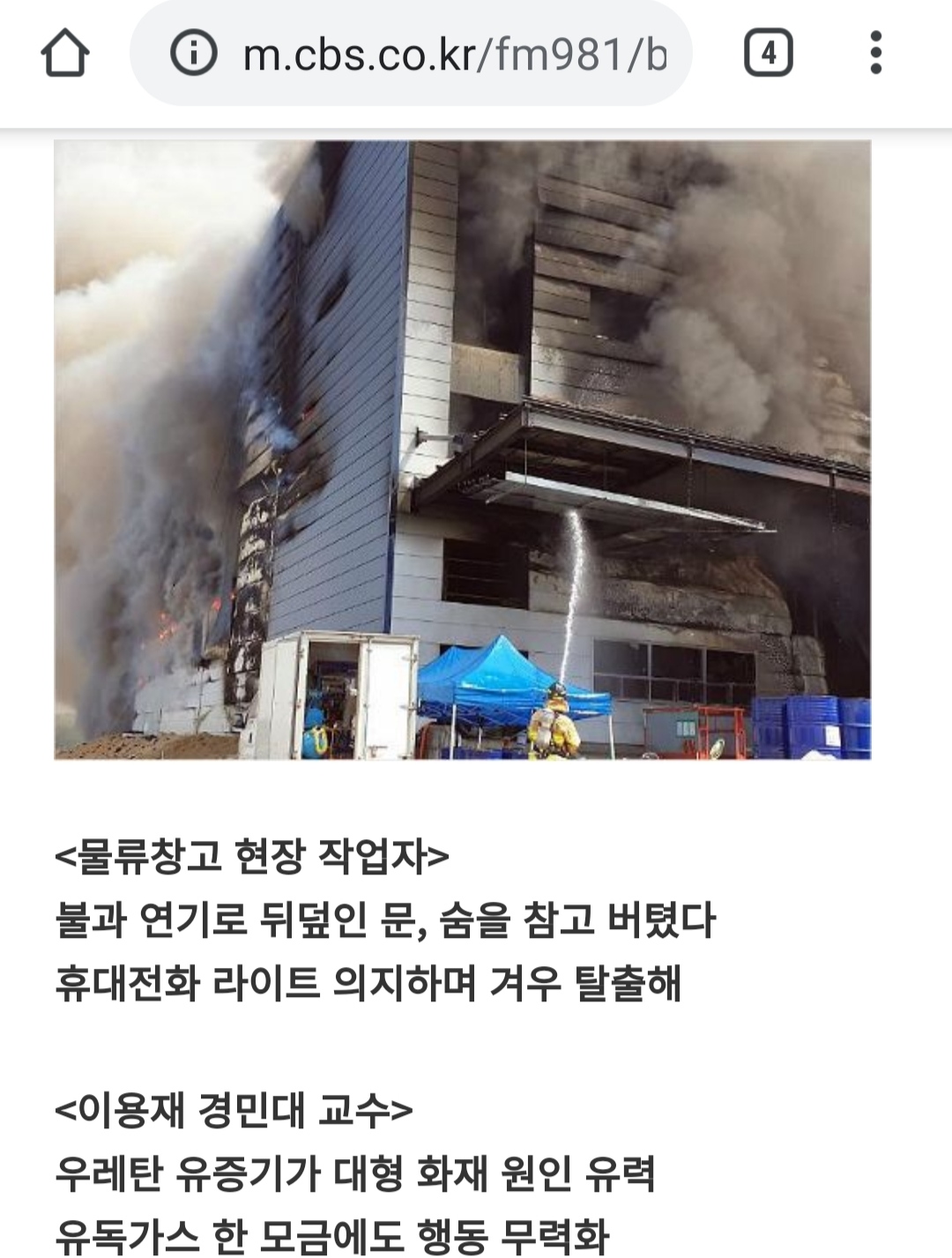 ◇ 김현정> 그런데 교수님, 지난주에 경기도 군포 물류창고 화재. 그 컸어요. 컸고 재산 피해는 200억원이나 났고요. 역시 50여 명의 노동자가 그 건물에 있었습니다. 그런데 인명피해는 나지 않았거든요. 그때와 이번의 차이.
