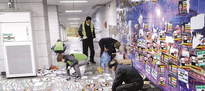 미관 해치고 미끄러워 사고 우려, 지하철 미화원들이 떼려다 포기… 외주업체 5시간 걸려 40% 없애