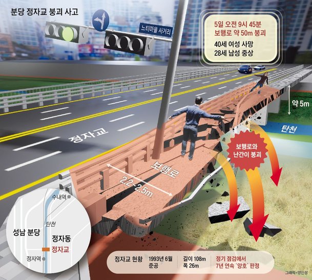 1993년 6월 개통한 정자교는 길이 108m, 너비 26m에 왕복 6차로 차도가 있고 그 바깥쪽에는 가드레일로 분리된 너비 2.2~2.5m의 보행로가 양쪽으로 설치돼 있다. 이날 사고는 아파트 단지인 느티마을에서 탄천을 건너 정자역으로 가는 오른쪽(북쪽) 보행로 약 50m가 무너진 것이었다. 보행로는 물론 난간과 이정표 등이 다리 아래 탄천 변으로 우르르 쏟아졌다. 차로는 가장자리 아스팔트 일부만 무너졌다.