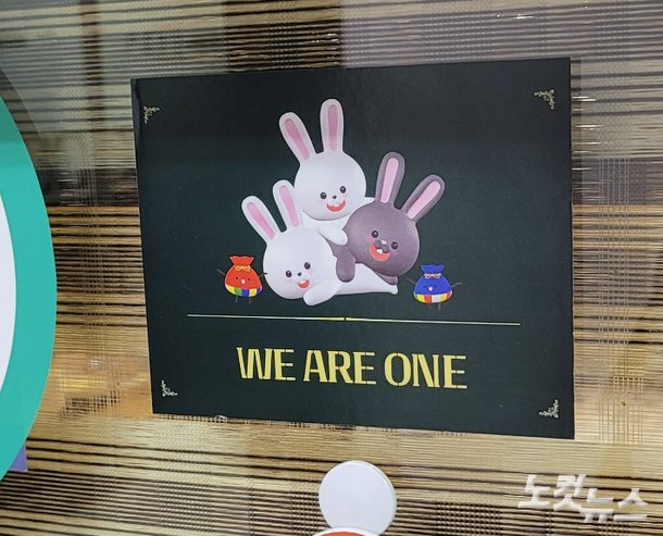 검은색 바탕의 스티커에는 토끼와 복주머니 캐릭터 그림, 또 'WE ARE ONE'이라는 노란색 문구가 새겨져 있다. '위아원'은 지난해 7월 신천지가 정식 출범한 청년봉사단의 이름이다.