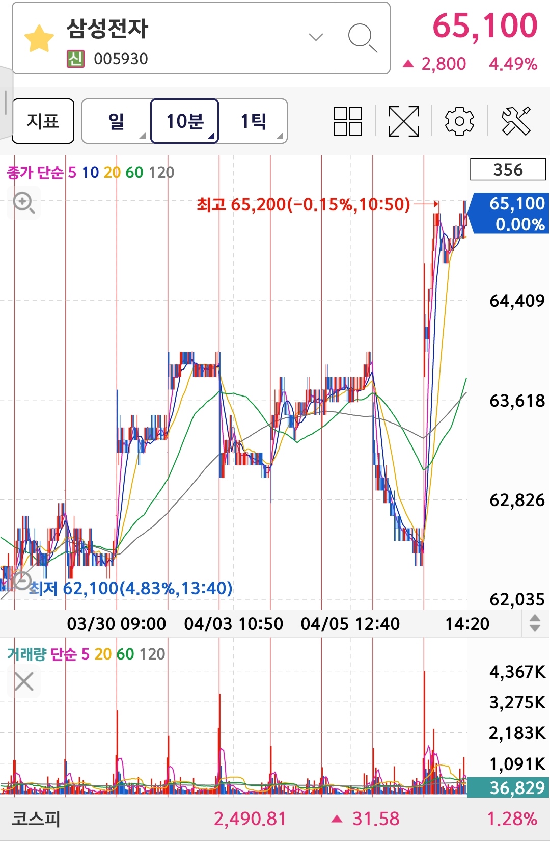 삼성전자 주가는 오후 1시 기준으로 유가증권시장에서 전 거래일보다 4.3% 오른 6만5000원에 거래 중이다. 거래 시작하자 마자 3.5% 넘게 올랐고, 조금씩 상승폭이 커지고 있다.