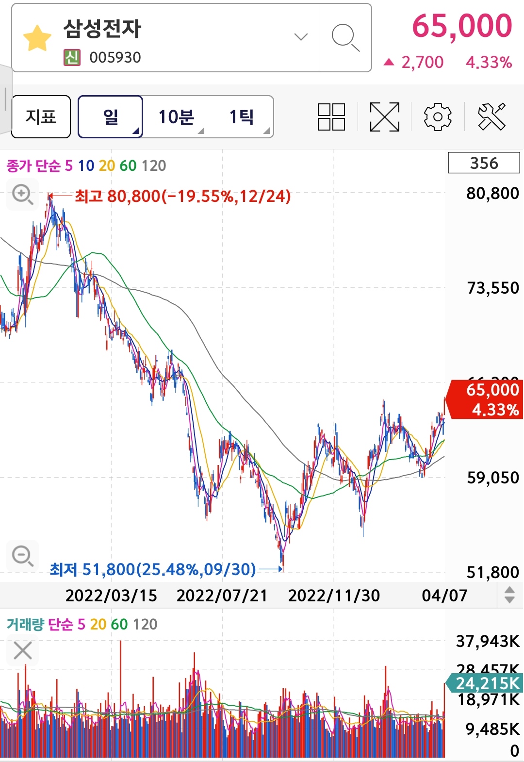 삼성전자 주가는 오후 1시 기준으로 유가증권시장에서 전 거래일보다 4.3% 오른 6만5000원에 거래 중이다. 거래 시작하자 마자 3.5% 넘게 올랐고, 조금씩 상승폭이 커지고 있다.