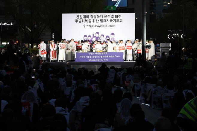 ‘정의구현전국사제단 비상대책위원회(사제단 비대위)’가 10일 저녁 서울광장에서 ‘친일매국 검찰독재정권 퇴진과 주권회복을 위한 월요 시국미사’를 열었다.