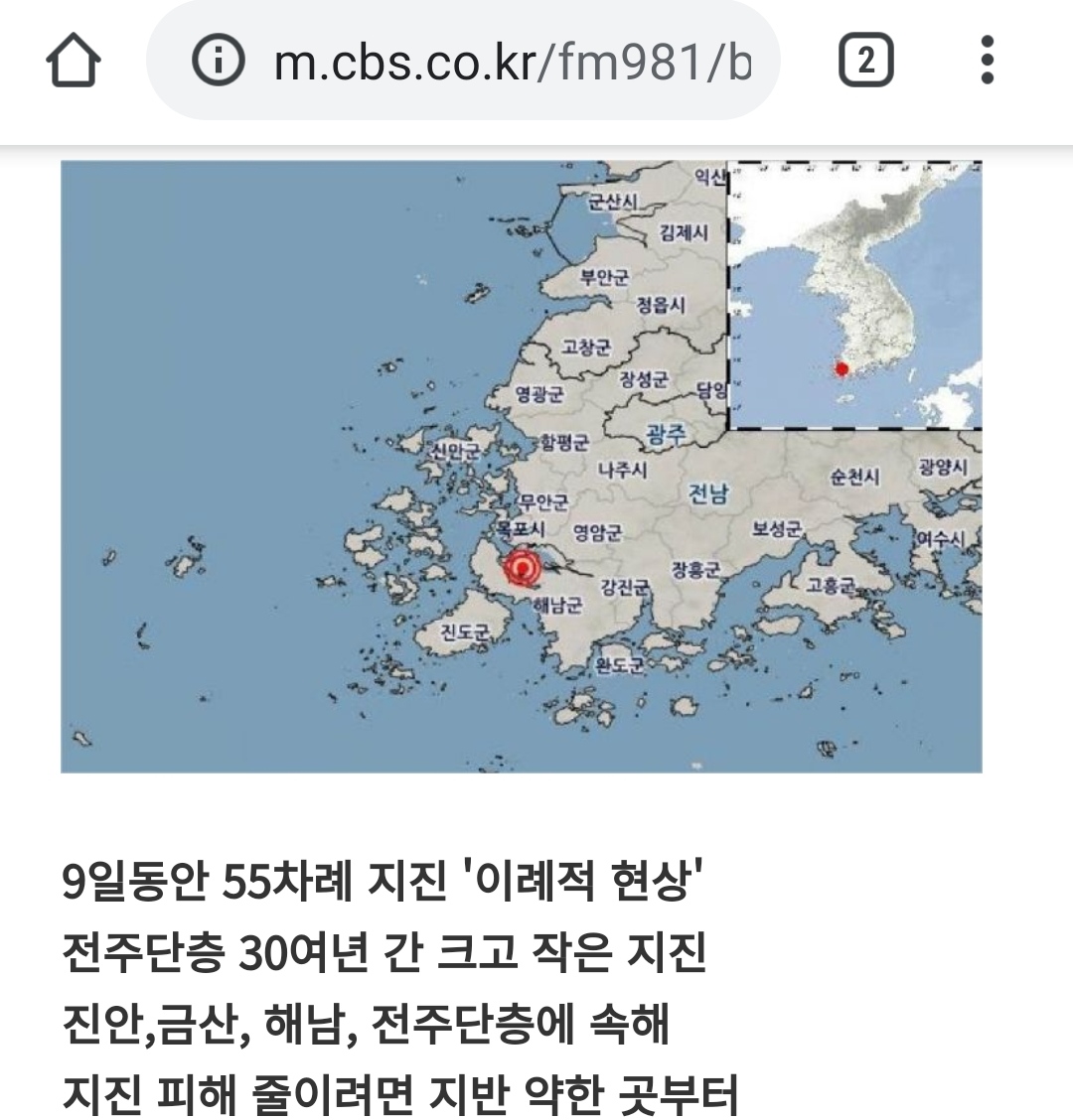 ◇ 김현정> 아, 그러니까 우리가 편의에 의해서 행정구역을 나눠놨기 때문에 해남이라는 지역에서는 관측이 안 됐을지 모르지만 그 주변에 목포라든지 이런 곳에서는 쭉 크고 작게 발생을 해 왔다, 이 말씀이에요?