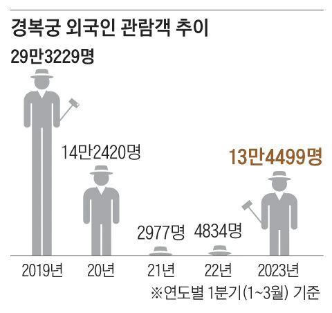 경복궁 관람객이 정점을 찍은 건 2019년. 창덕궁·창경궁 등 4대 궁과 종묘를 합해 1061만명을 기록해 처음으로 연간 궁궐 관람객 1000만명을 돌파했다. 이듬해 봄 코로나가 터지면서 급격히 꺾였다가 올해 본격적으로 회복하기 시작했다. 외국인 관람객은 지난해 1분기 4834명에서 올해 13만4499명으로 28배로 증가했다. 정성조 문화재청 궁능유적본부장은 “예전엔 중국인 관광객이 압도적이었다면, 유럽·남미·동남아 등 국적이 다양해진 것도 새로운 변화”라고 했다.