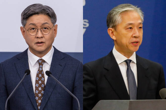 왼쪽부터 임수석 외교부 대변인과 왕원빈 중국 외교부 대변인. 연합뉴스
