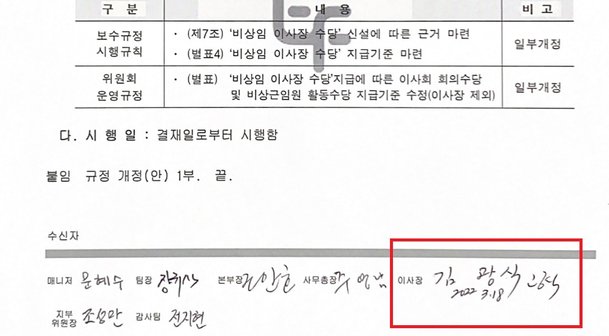 국민의힘 박정하 의원실이 입수한 자료에 따르면, 한국에너지재단은 작년 3월 ‘보수규정 시행규칙’을 개정했다. 월 230만원의 ‘비상임 이사장 수당’을 신설한다는 내용이다. 스스로에게 주는 수당 신설안 문건에는 김 이사장의 결재 사인도 남아 있다.