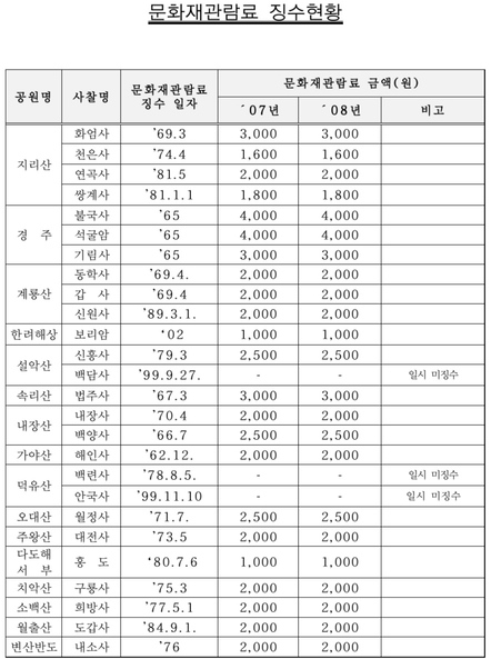 대통령 선거를 앞둔 상황에서 여야는 불교계 달래기에 나섰고 작년 5월 문화재보호법을 개정해 개별 사찰이 문화재관람료를 감면하면 국가가 그 비용을 지원할 수 있도록 했다. 각 사찰이 등산객들로부터 직접 받던 문화재관람료 액수만큼 국가가 세금으로 지원할 수 있도록 법을 바꾼 것이다. 이를 위해 그동안 사찰이 징수한 문화재관람료를 기준으로 올해 419억원의 예산이 편성됐다.
