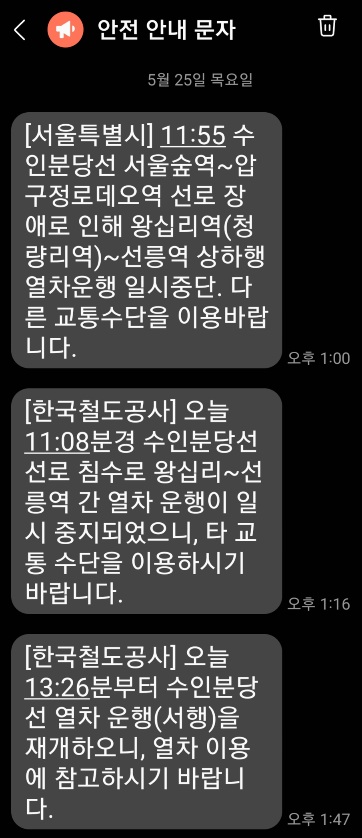 안전 안내 문자 [한국철도공사] 오늘 11:08분경 수인분당선 선로 침수로 왕십리~선릉역 간 열차 운행이 일시 중지되었으니, 타 교통 수단을 이용하시기 바랍니다. 열차 운행(서행)을 재개