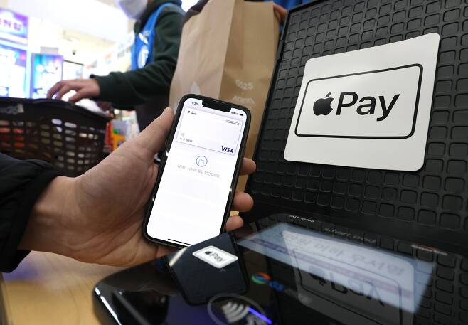 서울 강남구 GS25 역삼홍인점에서 직원이 애플의 간편 결제 서비스 '애플페이' 결제를 시연하고 있다. /뉴스1