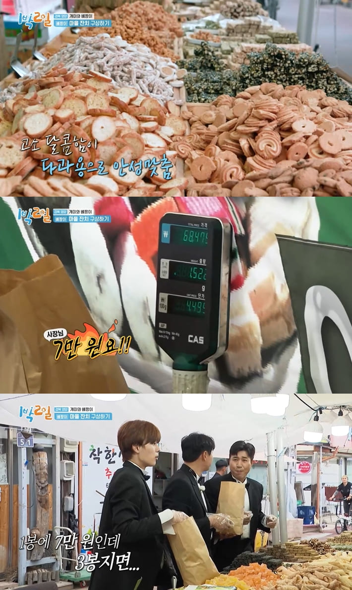 4일 방송한 '1박 2일'에서는 베짱이 팀이 마을 잔치를 구상하는 내용이 나왔다. 시장에 가서 우연히 옛날 과자를 본 연정훈, 김종민, 유선호는 각자 한 봉지씩 총 세 봉지를 챙겼다. 이들이 "너무 많이 샀나?"라고 걱정하자, 상인은 "얼마 안 나오는데 뭘"이라고 너스레를 떨었지만 100g당 단가가 4499원으로 한 봉지가 거의 7만 원에 육박해 경악했다. 실제로 저울에는 6만 8749원이라고 나타났으나 7만 원이라고 올려 부른 상인의 태도도 도마 위에 올랐다.