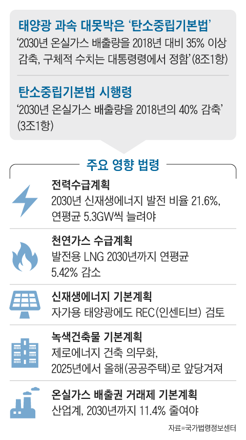 15일 정부와 업계에 따르면 지난 정부가 임기 말 공포한 ‘탄소중립기본법’은 국가 전반의 에너지 계획을 망가뜨리는 주범으로 꼽힌다. 지난 정부는 2021년 국제사회에 2030년 온실가스 배출량을 2018년 대비 40% 줄이겠다고 선언하고, 이를 탄소기본법과 시행령에 못 박았다. 이런 탓에 국가의 주요 에너지 계획은 물론 지자체 계획까지 이에 맞춰야 했다. 발전소 건설, 천연가스 계약은 물론, 철강 생산, 아파트 건설에 이르기까지 국가 경제·산업 전반을 무리한 ‘온실가스 감축 목표’에 구속해 둔 것이다. 손양훈 인천대 교수는 “일부 EU(유럽연합) 국가를 제외하면 온실가스 감축 목표를 법으로 정한 나라는 우리밖에 없다”며 “법에 목표를 못 박은 탓에 다른 법률과 계획이 영향을 받으며 국가 경제를 위협하고 있다”고 말했다.