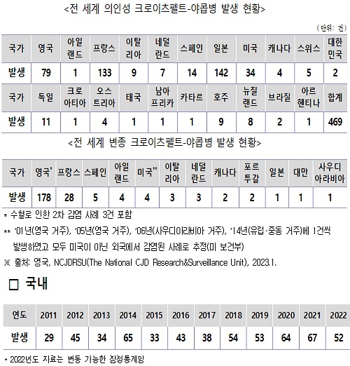 전 세계 크로이츠펠트-야콥병(CJD) 변종 12개국 232건 발생…국내 광우병·vCJD환자 발생사례 ‘0’