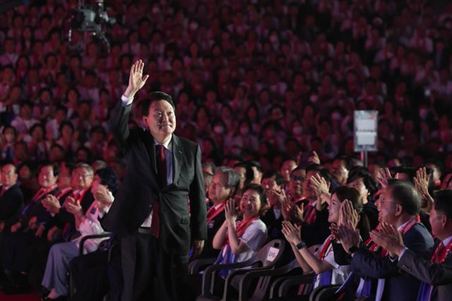 윤석열 대통령이 28일 서울 중구 장충체육관에서 열린 한국자유총연맹 제69주년 창립기념행사에서 강석호 한국자유총연맹 총재의 소개에 손을 들어 인사하고 있다. 대통령실제공
