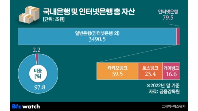 금융감독원에 따르면 지난해 말 기준 인터넷은행 3사의 총 자산은 79조5000억원으로 국내은행(3570조원)의 2.2% 수준이다.